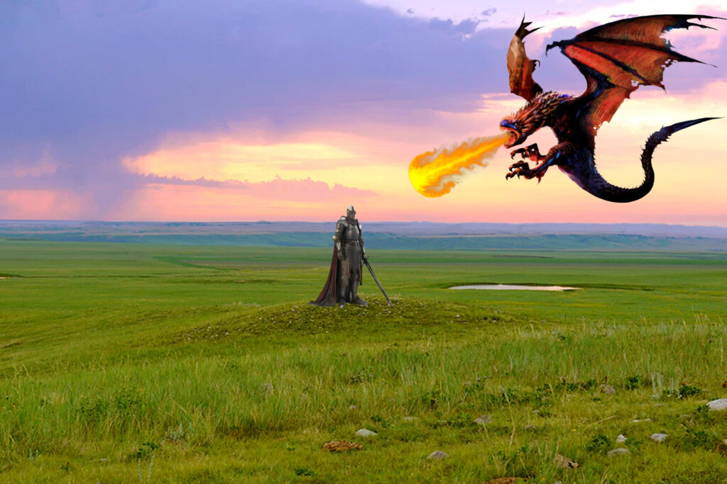 This is an image of a field with a dragon, a knight and fire edited in.
